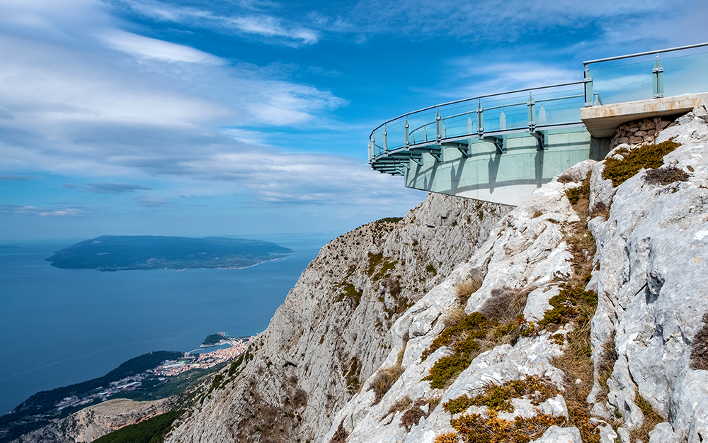 Der Aussichtspunkt Nebeska šetnica – Skywalk Biokovo hat eine halbkreisförmige Form mit einem Durchmesser von 8,5 Metern, ragt zusammen mit flachen Teilen etwa 11 Meter über den Rand der Klippe hinaus und ist der erste Skywalk in Kroatien.